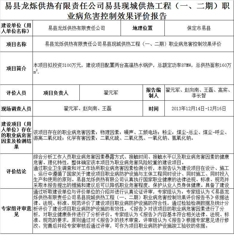 易县龙烁供热有限责任公司易县县城集中供热工程(一、二期)职业病危害控制效果评价